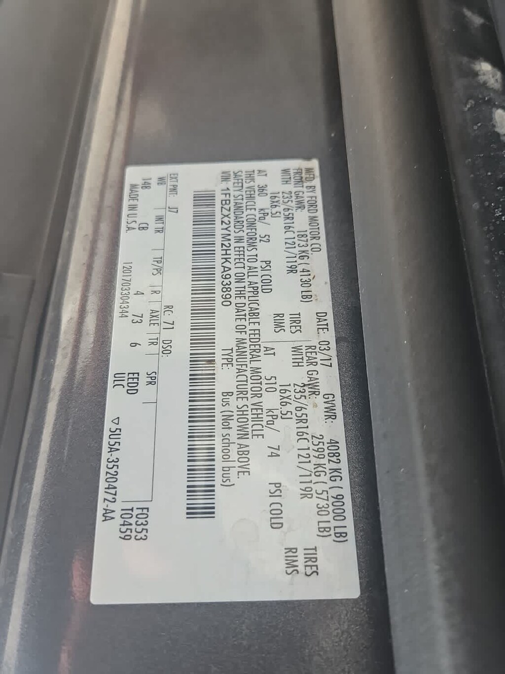 Lithia Ford and Lincoln of Fresno is pleased to offer this Magnetic Metallic 2017 Ford Transit-350 XLT for purchase, this vehicle is well equipped with many features including: Exterior Upgrade Package, Order Code 302A (Cruise Control w/Message Center and Vinyl Sun Visors), 15-Passenger Seating, 3.73 Axle Ratio, SYNC 3 Communications & Entertainment System, 3rd row seats: bench, 4-Wheel Disc Brakes, 4th-Row Bench Seat, 8 Speakers, ABS brakes, Air Conditioning, AM/FM radio, Brake assist, CD player, Cloth Front Bucket Seats, Driver & Front Passenger-Side Front Airbags, Driver door bin, Driver vanity mirror, Drivers Seat Mounted Armrest, Dual Bucket Seats w/Dr Manual Lumbar (21L), Dual Bucket Seats w/Power Driver Seat (21F), Dual front impact airbags, Dual front side impact airbags, Electronic Stability Control, Exterior Parking Camera Rear, Front anti-roll bar, Front Bucket Seats, Front License Plate Bracket, Front reading lights, Front wheel independent suspension, Fully automatic headlights, Heavy-Duty Alternator, Illuminated entry, Lane Keeping Alert w/Driver Alert, Leather-Wrapped Steering Wheel, Low tire pressure warning, Occupant sensing airbag, Overhead airbag, Panic alarm, Passenger door bin, Passenger seat mounted armrest, Passenger vanity mirror, Power door mirrors, Power steering, Power windows, Privacy Glass, Radio: AM/FM Single-CD Stereo, Radio: AM/FM Stereo w/SYNC3/Navigation, Rain sensing wipers, Rear air conditioning, Rear reading lights, Rear seat center armrest, Rear Window Defogger, Remote keyless entry, Remote Keyless-Entry Keypad, Reverse Sensing System, Running Board, Safety Canopy Side-Curtain Airbags, SecuriLock Passive Anti-Theft System, Speed control, Tachometer, Telescoping steering wheel, Tilt steering wheel, Traction control, Trip computer, Variably intermittent wipers, and Wheels: 16 Steel w/Full Black/Silver Cover. RWD 3.7L V6 Ti-VCT 24V 6-Speed Automatic with Overdrive XLT