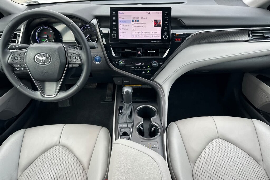 Lithia Ford and Lincoln of Fresno is pleased to offer this 2021 Toyota Camry Hybrid XSE for purchase, this vehicle is well equipped with many features including: 2.5L I4 DOHC 16V, 4-Wheel Disc Brakes, 6 Speakers, ABS brakes, Air Conditioning, Alloy wheels, AM/FM radio: SiriusXM, Apple CarPlay/Android Auto, Auto High-beam Headlights, Auto-dimming Rear-View mirror, Automatic temperature control, Brake assist, Bumpers: body-color, Delay-off headlights, Driver door bin, Driver vanity mirror, Dual front impact airbags, Dual front side impact airbags, Electronic Stability Control, Emergency communication system: Safety Connect with 1-year trial, Exterior Parking Camera Rear, Four wheel independent suspension, Front anti-roll bar, Front Bucket Seats, Front Center Armrest, Front dual zone A/C, Front reading lights, Fully automatic headlights, Garage door transmitter: HomeLink, Heated door mirrors, Heated front seats, Illuminated entry, Knee airbag, Low tire pressure warning, Multi-Stage Heated Front Bucket Seats, Occupant sensing airbag, Outside temperature display, Overhead airbag, Overhead console, Panic alarm, Passenger door bin, Passenger vanity mirror, Perforated Leather Seat Trim, Power door mirrors, Power driver seat, Power passenger seat, Power steering, Power windows, Radio data system, Radio: AM/FM/HD Audio Plus, Rear anti-roll bar, Rear reading lights, Rear seat center armrest, Rear side impact airbag, Rear window defroster, Remote keyless entry, Security system, Speed control, Speed-sensing steering, Split folding rear seat, Spoiler, Steering wheel mounted audio controls, Telescoping steering wheel, Tilt steering wheel, Traction control, Trip computer, Turn signal indicator mirrors, Variably intermittent wipers, and Wheels: 8.0J x 19 Machined Finish Alloy. FWD 2.5L I4 DOHC 16V eCVT XSE